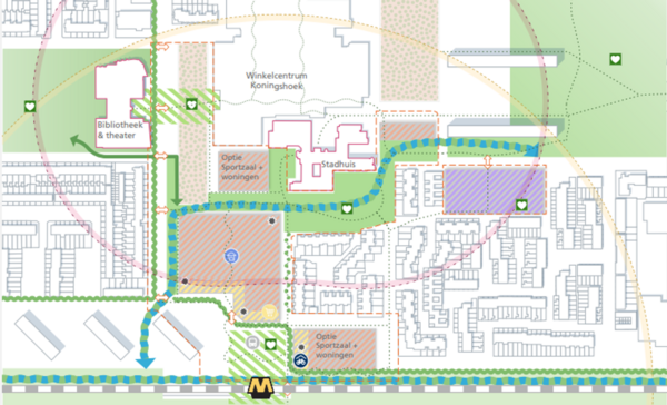 In de gebiedsvisie zijn twee mogelijke locaties aangegeven voor een met appartementen gecombineerde sportzaal: aan de kant van het gemeentehuis/Koningshoek of anders bij het metrostation.
